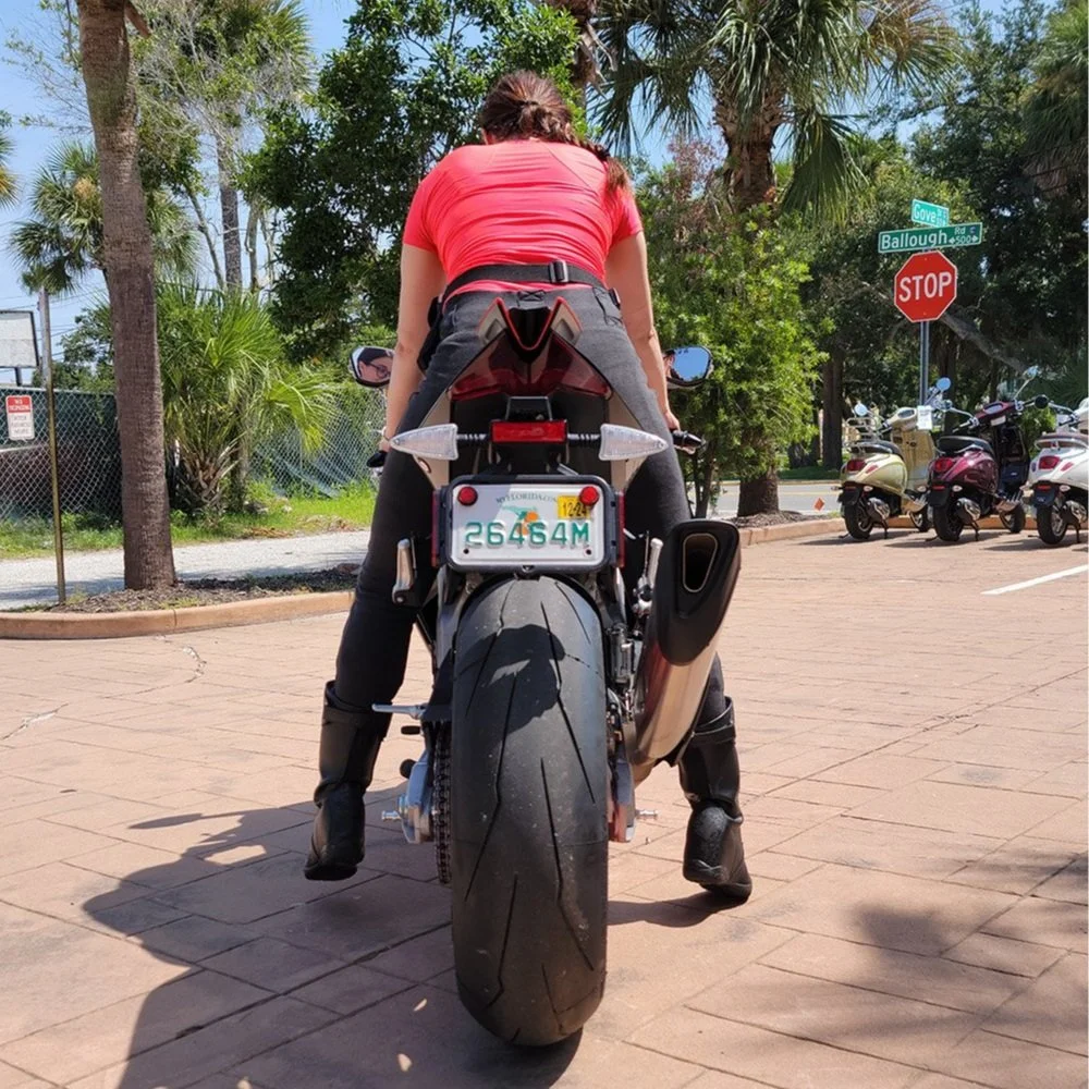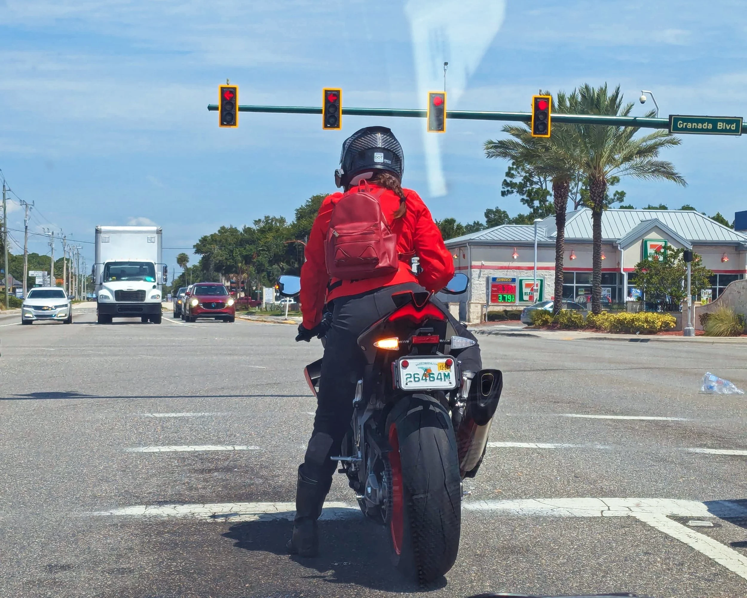 Could this powerful machine handle me: a 5 foot 4 biker girl who wears hi-viz gear in the daytime and uses her blinker amply before turning? Under that helmet I had the biggest grin on my face. I had a 3 hour route mapped out on REVER, and I was ready to replicate an average rider's experience! As I tip-toed the bike out of the parking lot in front of MotoPlex Daytona, looking like a waddling penguin, I wanted to find out how the RSV4 fared when it got a sweet taste of the mundane.