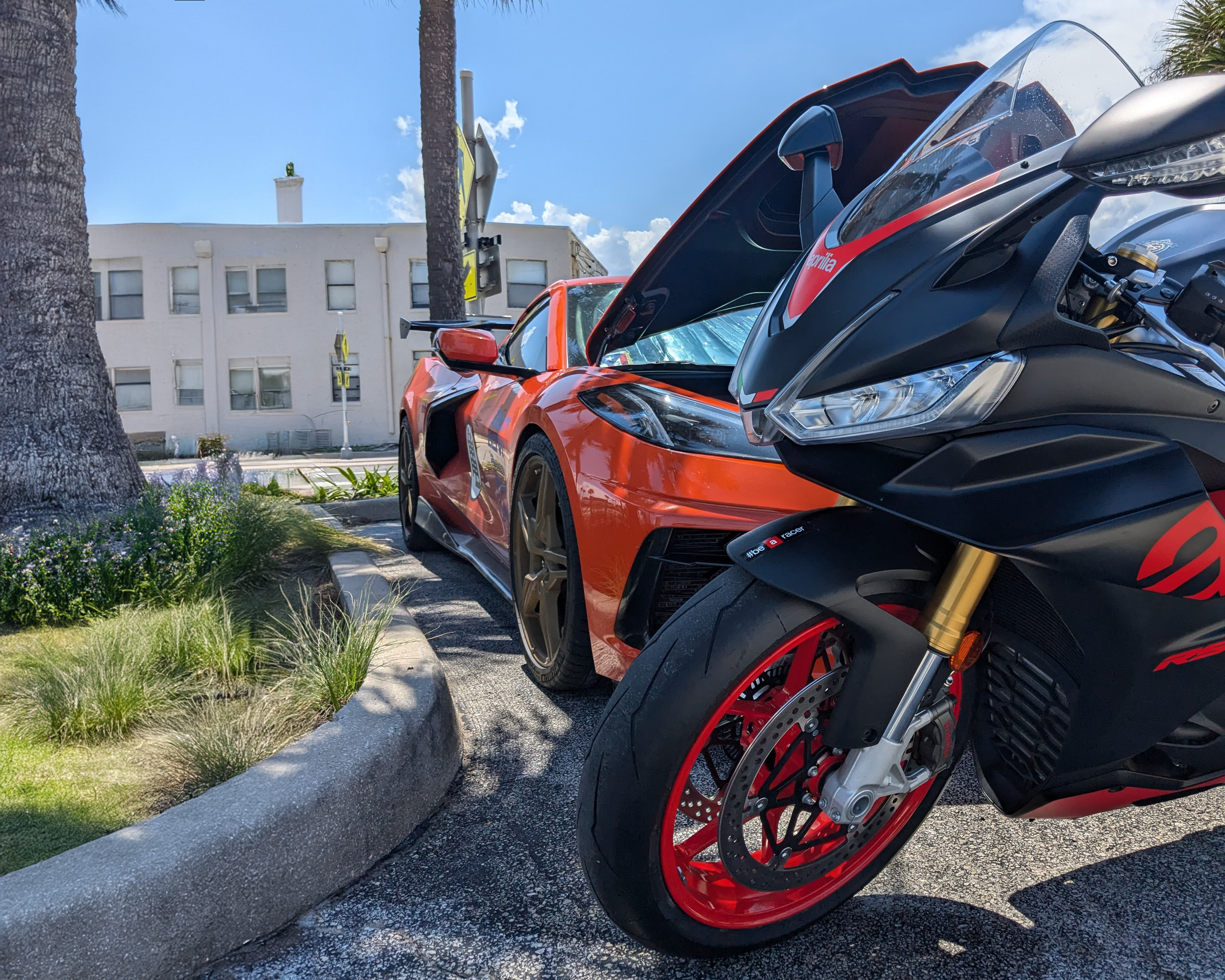 The first time I swung a leg over Aprilia’s 2024 RSV4 I found myself in sunny Daytona. I turned the key and the engine roared to life as I thought about how it has a top speed of 189 mph, 217 horsepower and 3 WSBK titles! The RSV4 also benefits from the technology of Aprilia’s RS-GP MotoGP bike. I was using it to grab some coffee and take a joy ride to the beach.